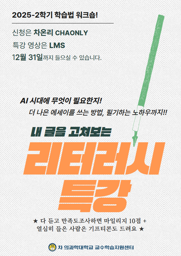 세부 주제는 ‘내 글을 고쳐보는 리터러시 특강’이며, 강의는 김시정 교수가 맡아 12월 31일 수요일까지 온라인에서 수강할 수 있다. 참여를 희망하는 학생은 CHAONLY(https://chaonly.cha.ac.kr)에서 특강을 신청한 후, LMS에서 영상을 수강하면 된다. 참여 혜택으로는 특강 영상 수강 후 만족도 조사를 완료한 학생 모두에게 마일리지 10점이 지급되며, 성실하게 시청한 학생들 중 20명에게는 추첨을 통해 기프티콘을 지급할 예정이다.